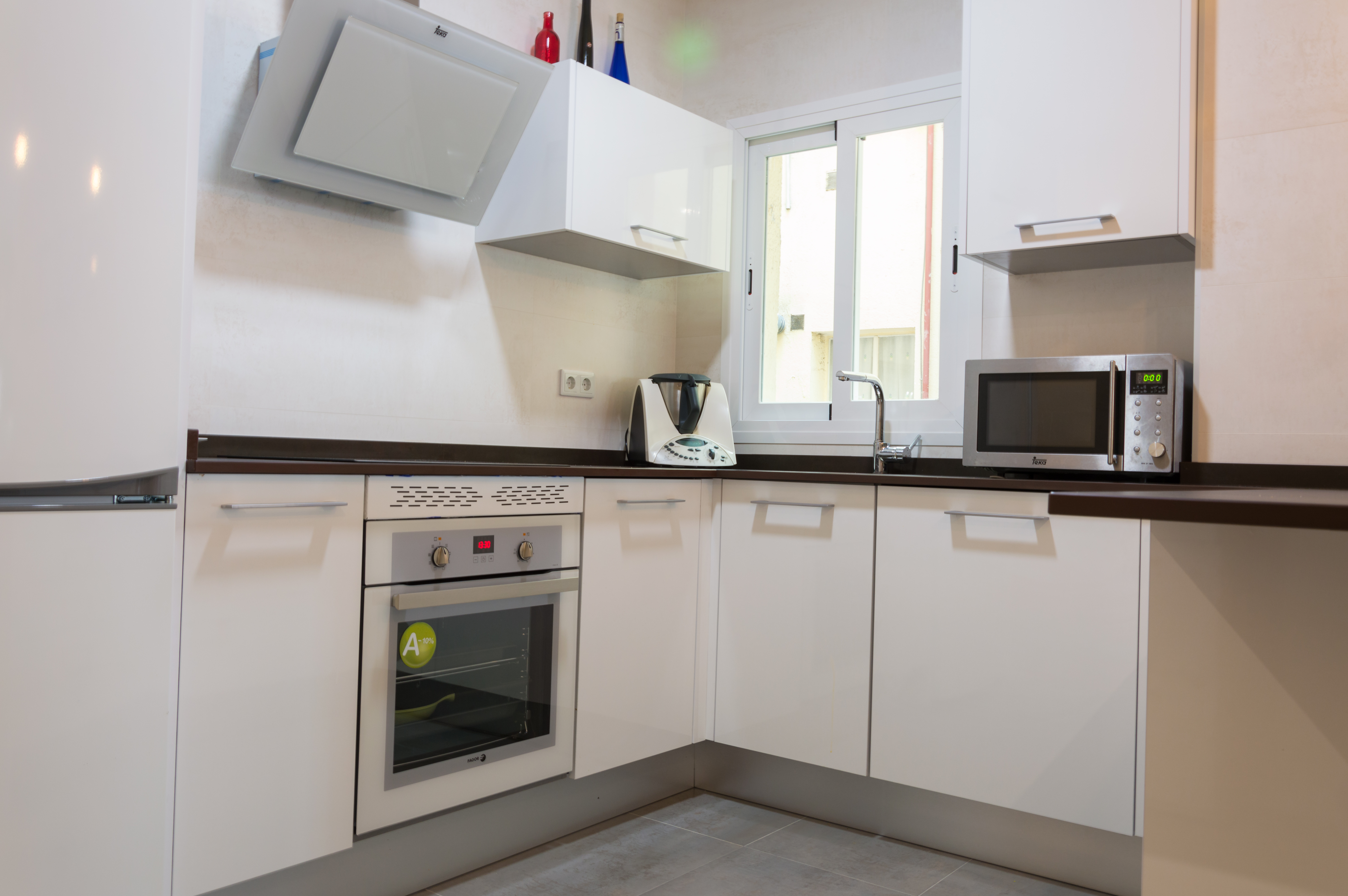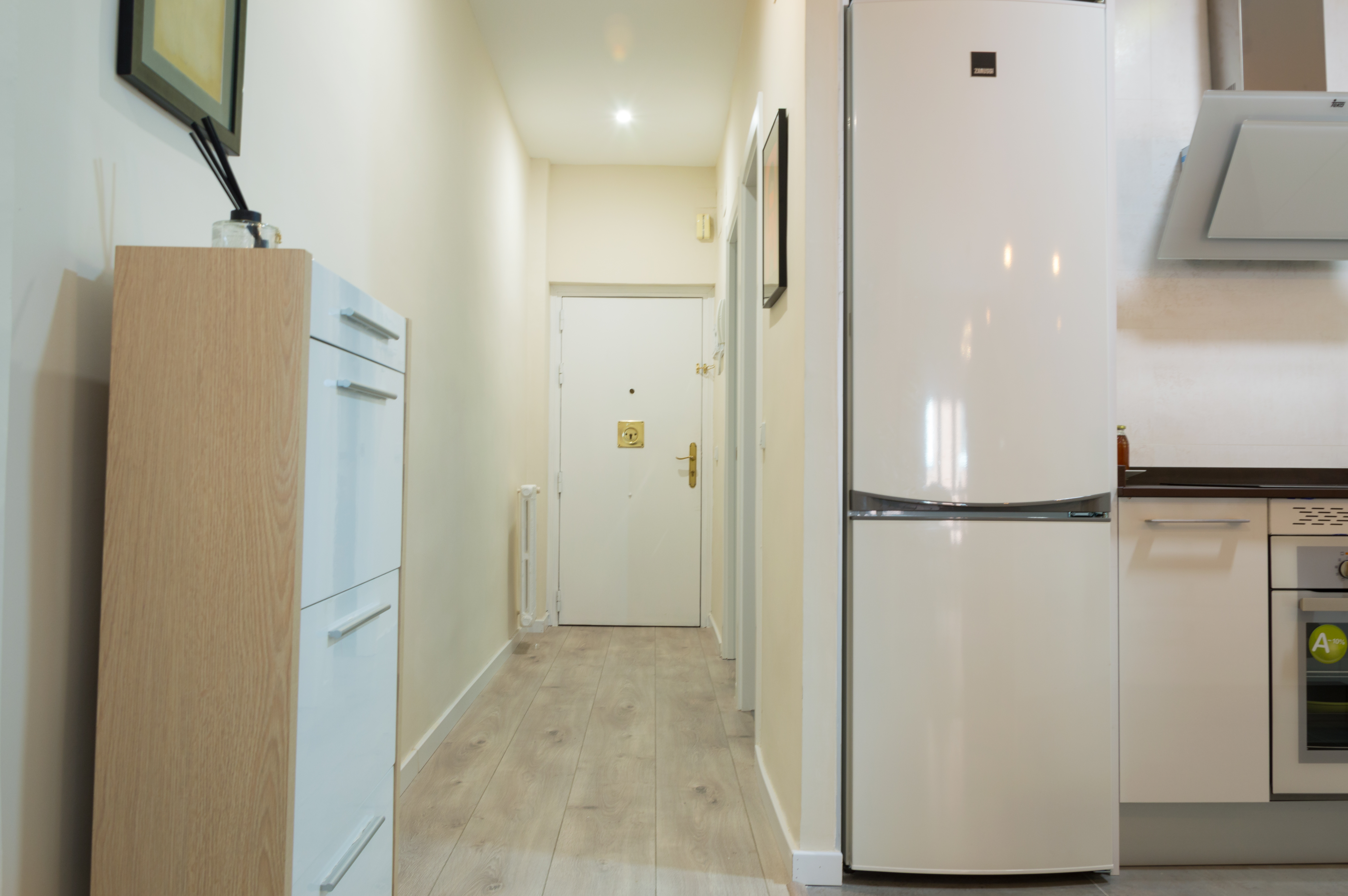 De esta manera hemos ampliado la cocina, pero si la cocina fuera americana ganaríamos más espacio aún. y podríamos ampliar también el dormitorio de la entrada y el salón.