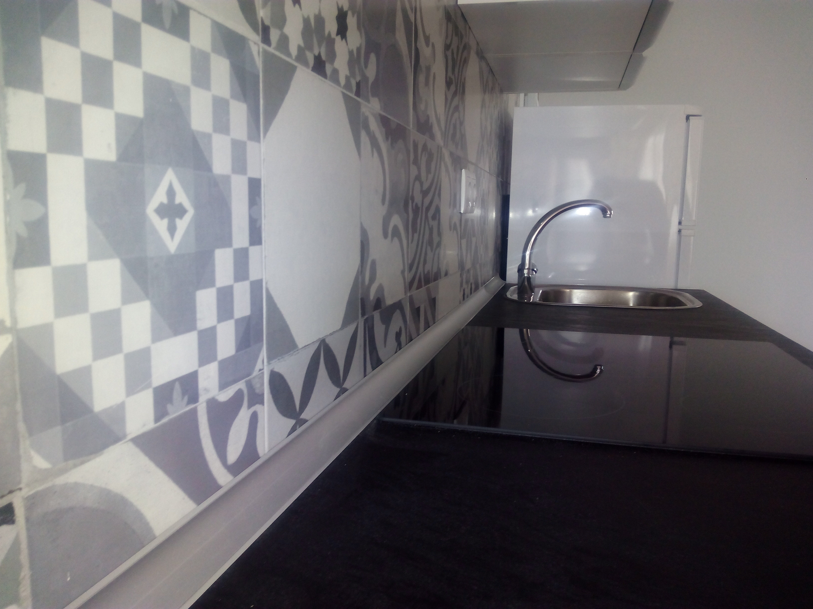 Para abaratar costes, solo se alicato entre muebles altos y bajos de los muebles de cocina, usando un azulejo porcelánico imitación a baldosa hidráulica.