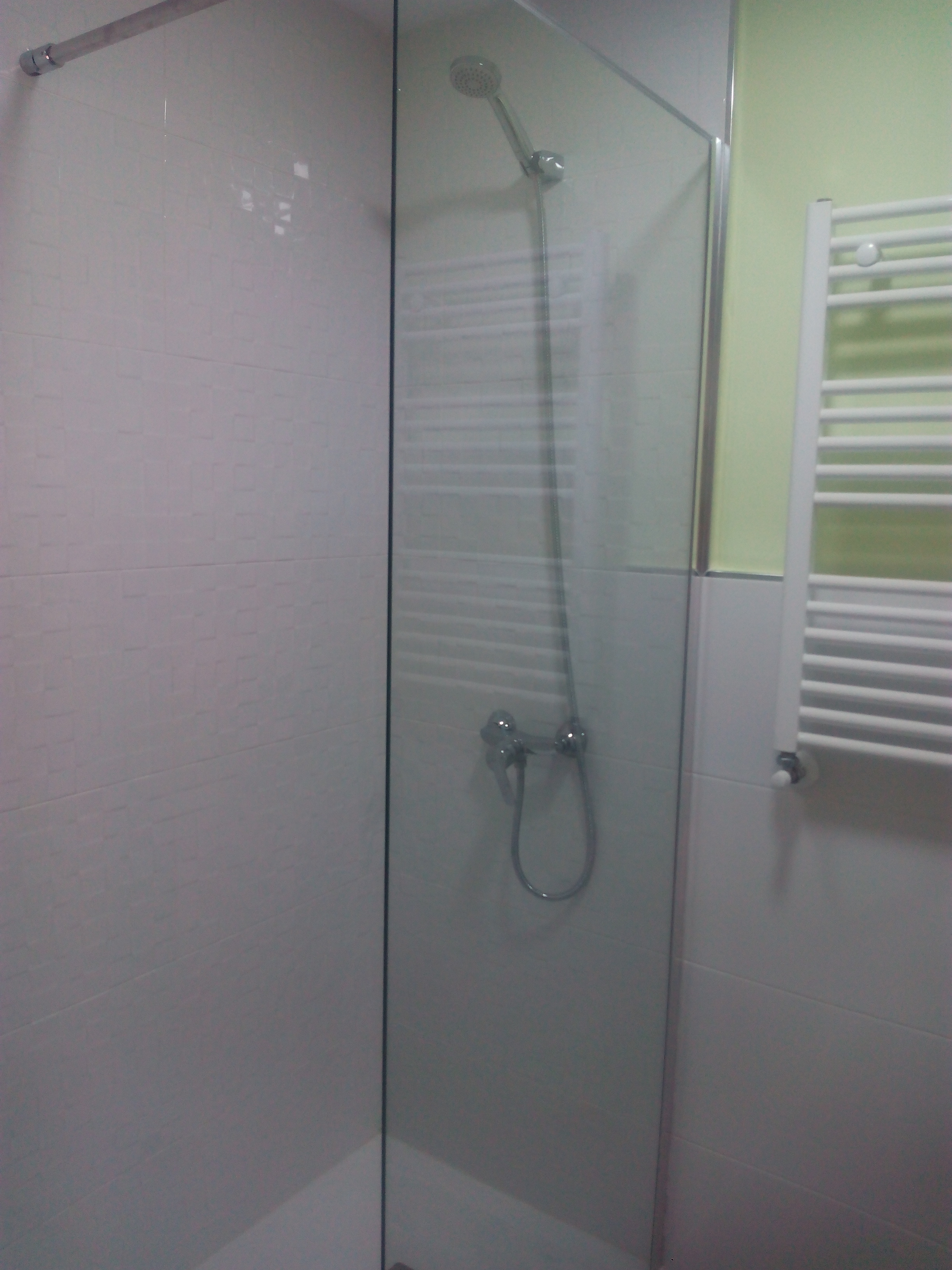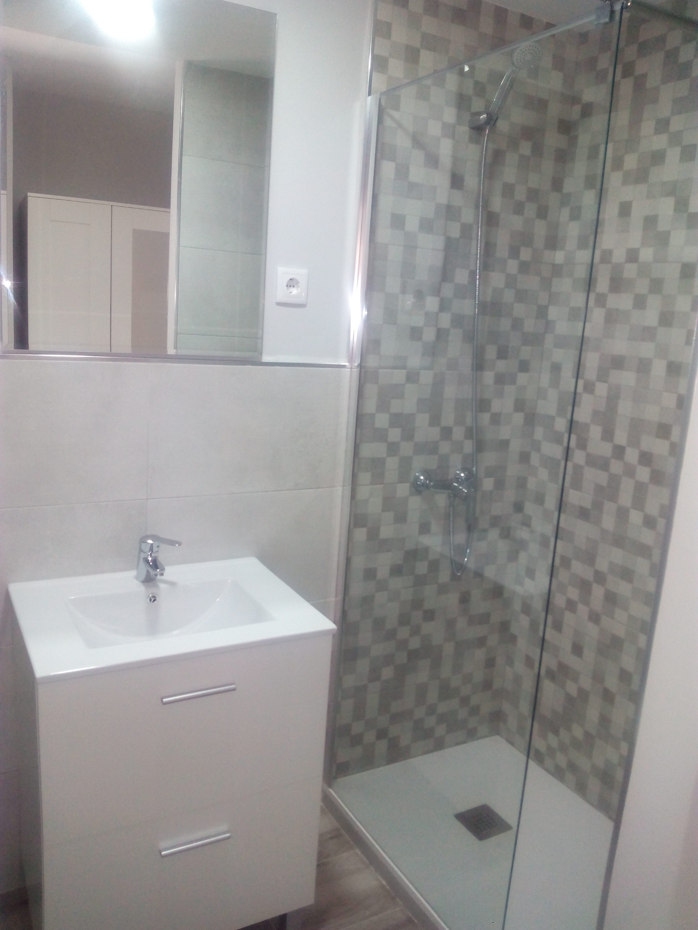 Por otro lado los baños se alicataron hasta 1.2m de alto y solo hasta arriba en la zona de la ducha, usando el blanco mate como azulejo principal, para aportar mayor luminosidad a los mismos, y dando un toque texturizado unicamente en la pared de la ducha, en un baño en el mismo blanco y en el otro en gris.